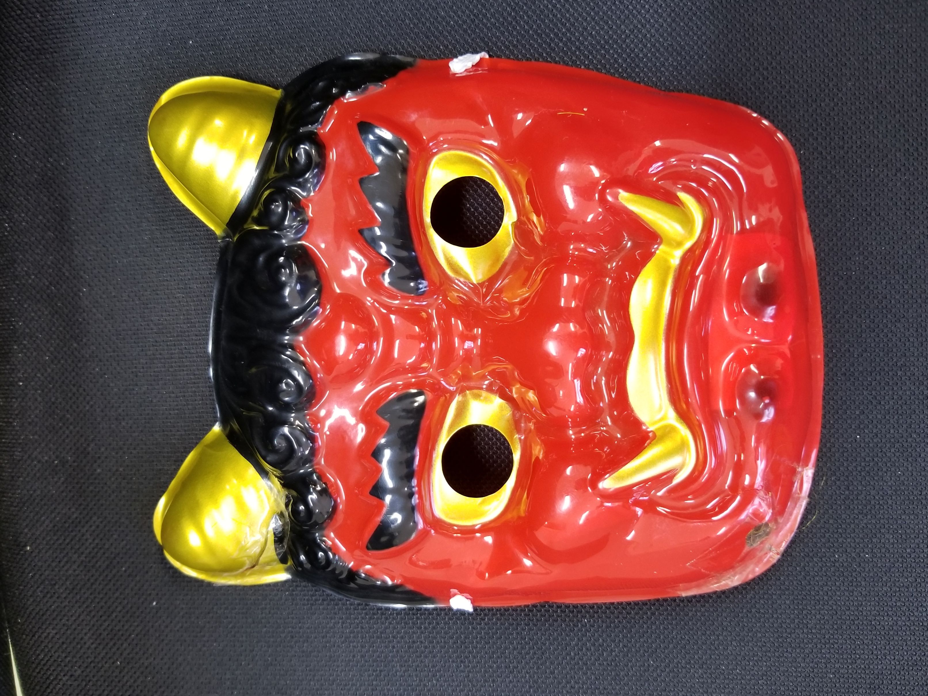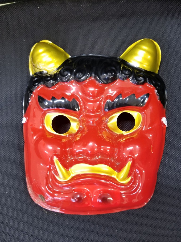 鬼のパンツ、鬼のお面、鬼のカツラを装着してとても怪しい鬼に変身しました。